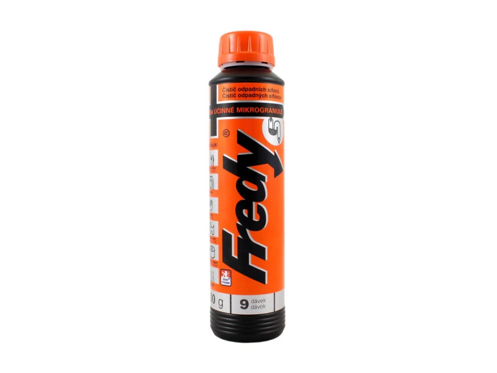 Čistič Fredy je vhodný na čistenie upchatých sifónov a preventívne čistenie. Odstraňuje vlasy, chlpy, tuky, zvyšky potravín, vatu a nepríjemné pachy. Kryštalický čistič Fredy je zložený z mikroperličiek, ktoré sa dobre rozpustia a efektívne tak odstránia usadeniny. Návod na použitie: Za stáleho tlaku na uzáver otvárajte v smere šípky. Do sifónu umývadla, výlevky, vane, WC, nalejte asi pol litra veľmi horúcej vody. Potom vsypte 2–3 viečka Fredy v závislosti od veľkosti sifónu. Nechajte pôsobiť asi 10 min. a potom prepláchnite horúcou vodou a priechodnosť odpadu skontrolujte väčším prúdom tečúcej vody. Pri väčšom zanesení zopakujte po dvoch dňoch, preventívne po dvoch týždňoch. Objem: 500g / 9 dávokDiskusia