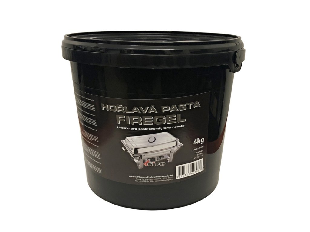 Horľavá pasta FIREGEL 4kg Horľavá pasta Firegel 4kg je určená pre gastronómiu na ohrev a udržiavanie teploty pokrmov. Táto pasta je vyrobená z vysoko kvalitného etanolu tak, aby mala čo najvyššiu výhrevnosť. Horí čistým, jasným modrým plameňom bez tvorby sadzí a zápachu.Diskusia