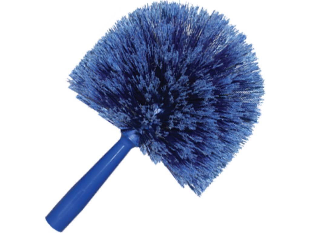 Ometač pavučín a prachu s guľatou hlavou na násadu so syntetickými štetinami. Priemer 18 cm. Farba červená a modrá.