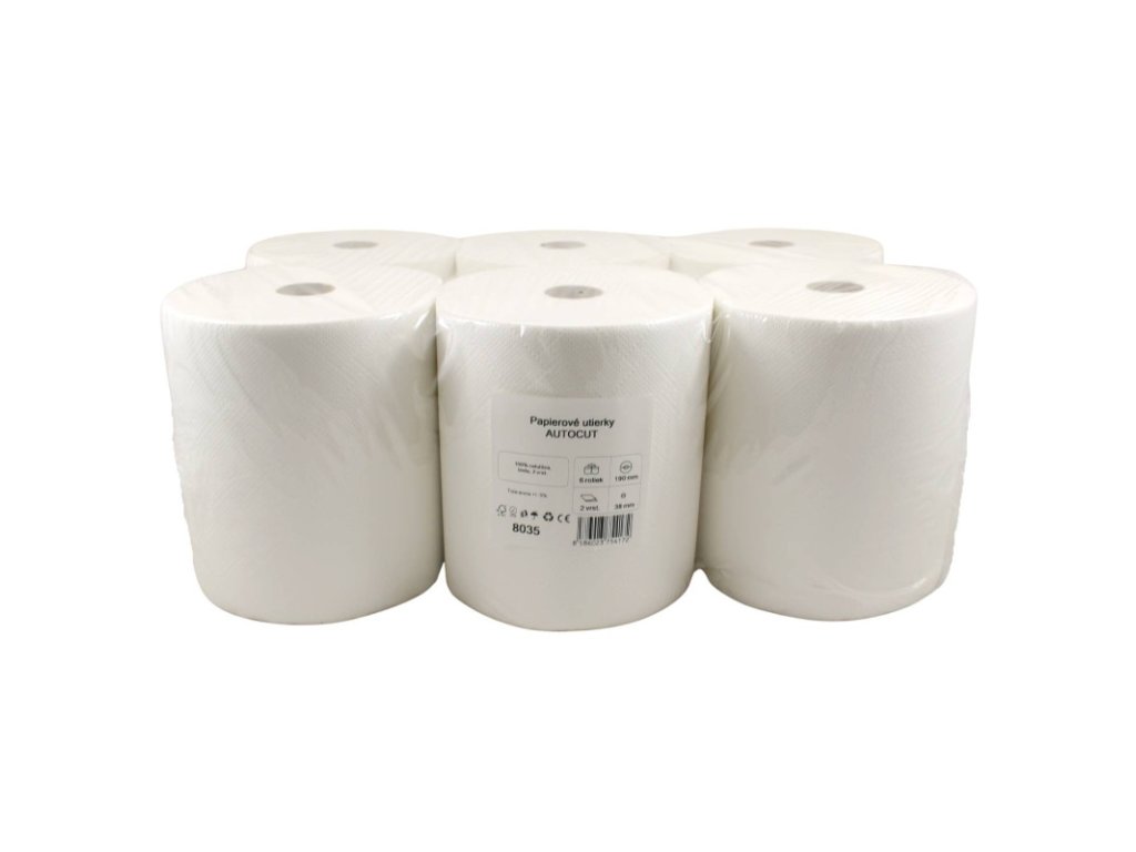 Papierová utierka 20 cm, 2vrst.,150m, 38mm AUTOCUT 6KS Papierová utierka 100%celulóza neperforovaná do automatických systémov Priemer rolky : 20cm Výška rolky: 20,5cm Priemer dutinky : 38mm Cena za balenie 6ksDiskusia