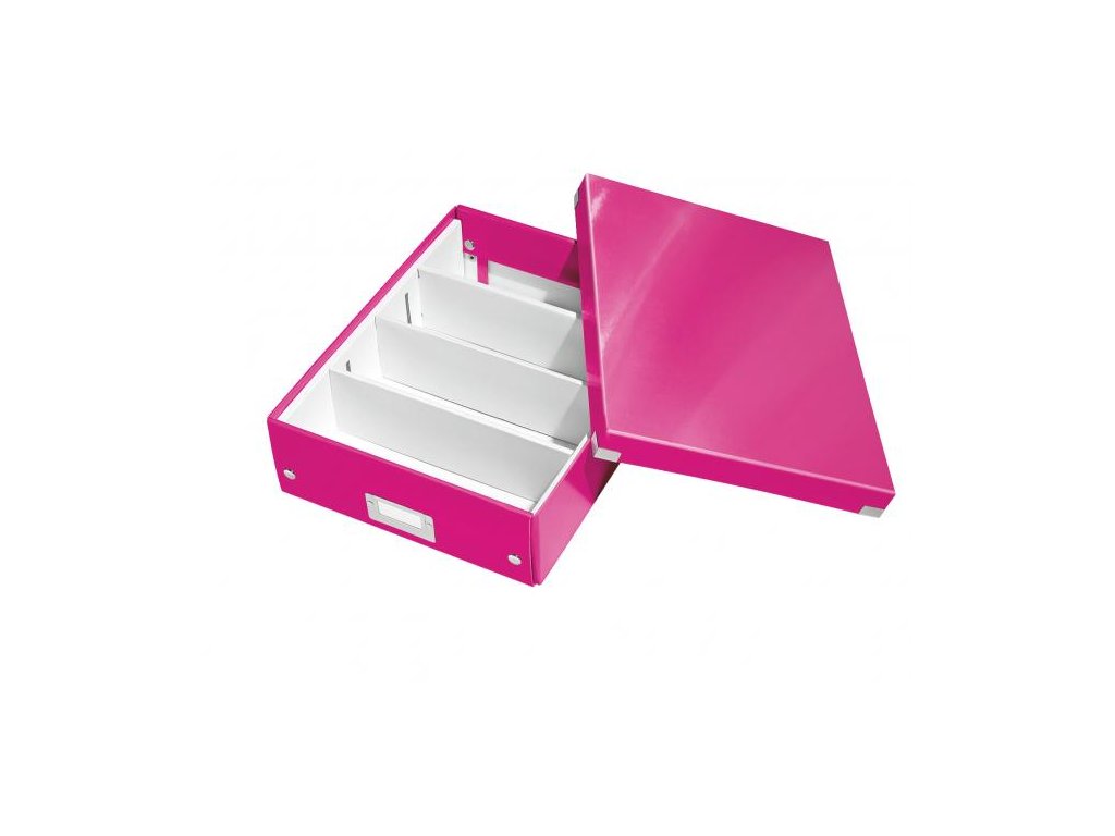 Archivačná krabica s vekom vo výrazných farbách WOW. Pevné a stabilné prevedenie. Materiál silný drevnatý kartón potiahnutý laminom. Rámik na štítok, vystužené rohy krabice a spojovacie cvoky vyrobené z kovu. Inteligentná skladacia konštrukcia - rýchle a jednoduché zloženie bez nutnosti použitia skrutiek a opätovné rozloženie, keď krabice práve nepoužívate. Dodávané rozložené. Väčšie balenie 6 ks. Krabica na usporiadanie káblov, nabíjačiek, slúchadiel, fotografi í a ďalších drobností. Na vylepšenie usporiadania obsahu slúži vnútorný systém priehradiek, s ktorým môžete rozdeliť krabicu na 2 alebo 3 časti a zabrániť tak miešaniu obsahov v jednotlivých častiach. Veľkosť M. Robustné kovové úchyty na jednoduchý prenos. Rozmery 280 × 100 × 370 mm.Dodatočné parametre