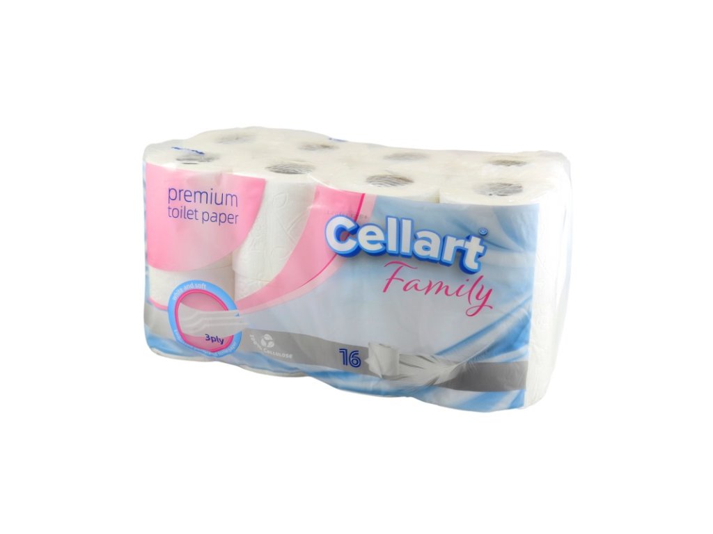 Toaletný papier CELLART FAMILY 3vrst. 100% celulóza 16ks Prémiová kvalita 3 vrst. celulózy v retailovom balení s úchytom Dĺžka: 16,5 m 150 útržkov