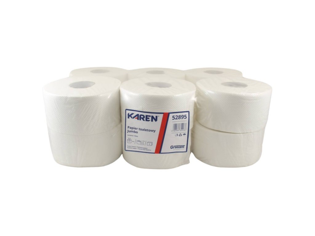 Toaletný papier KAREN JUMBO 190 - Super 147m professional Dĺžka 147m, 90mm šírka, priemer 190mm, 2-vrstvá 100% celulóza. Cena za balenie 12 roliek